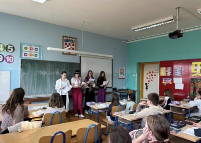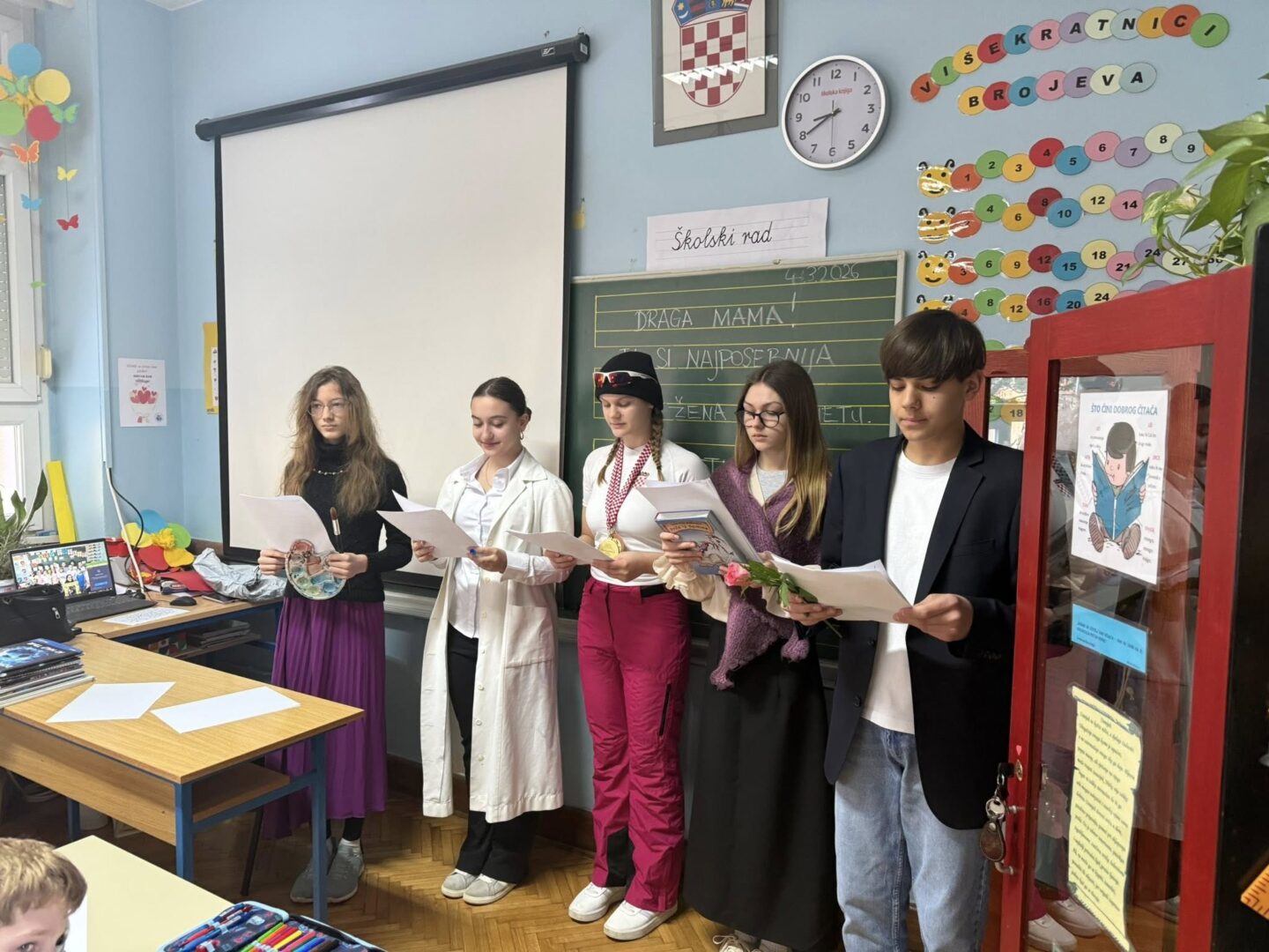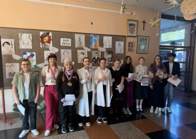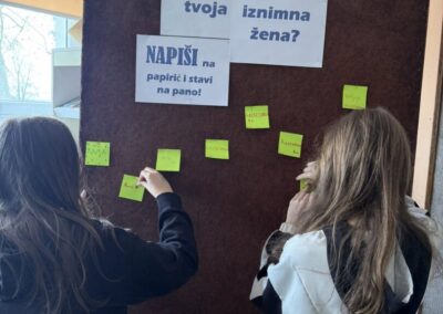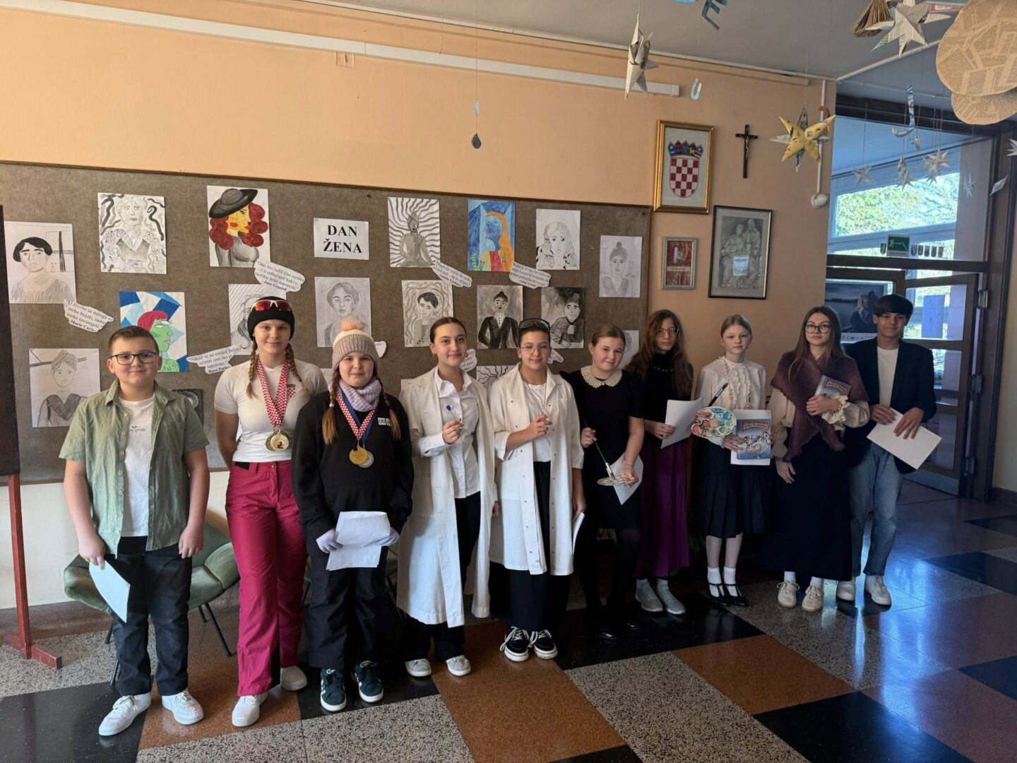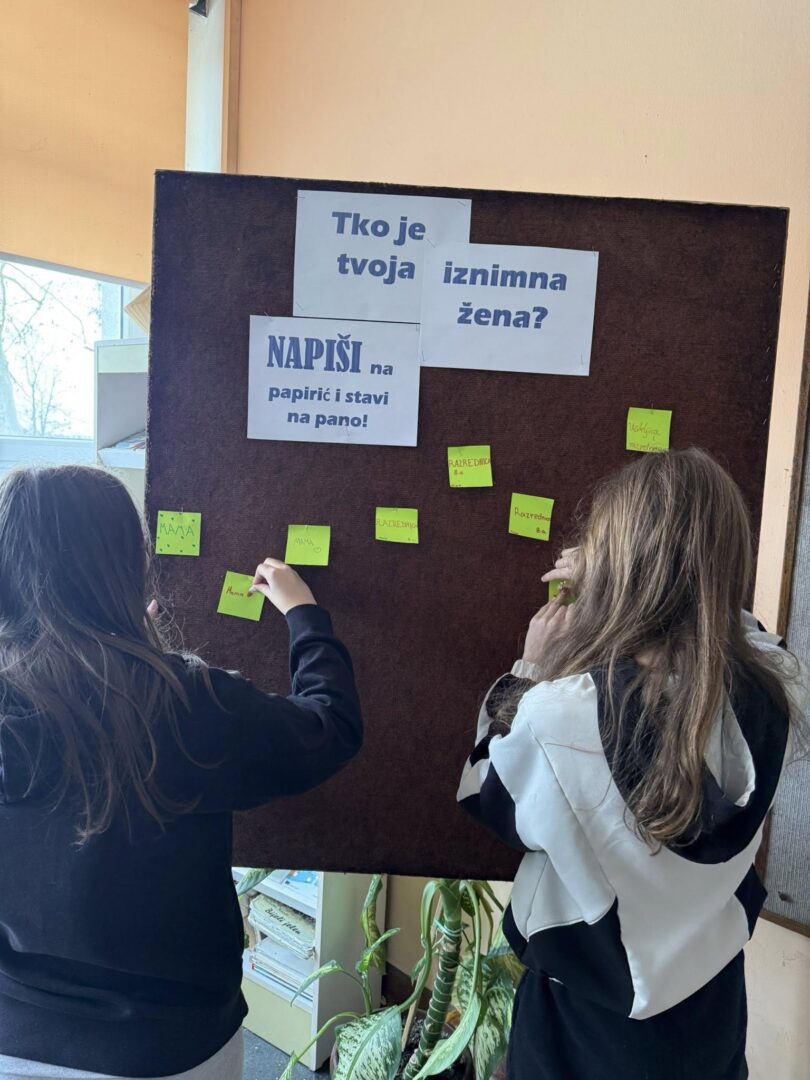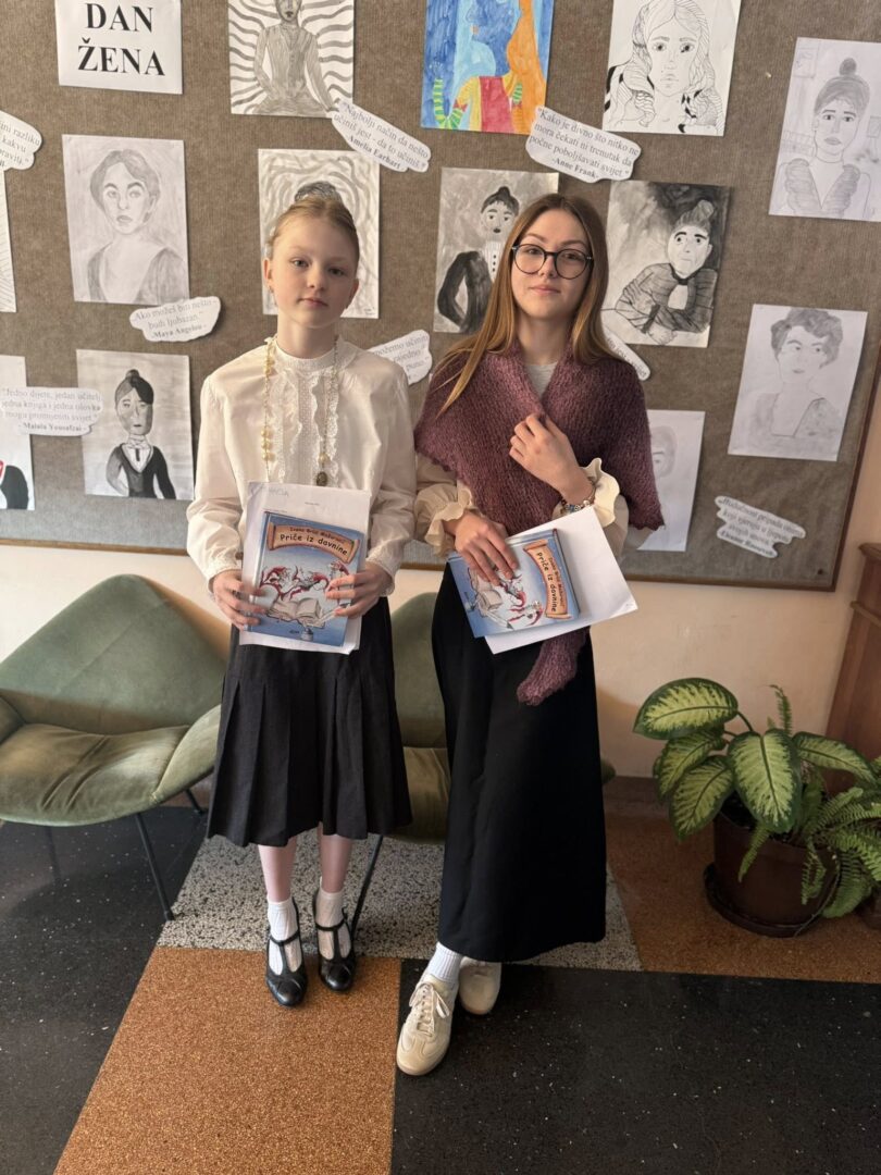 Uoči 8. ožujka u našoj smo školi obilježili Međunarodni dan žena. Učenici mladi knjižničari kroz prigodan tekst, odjeveni u posebno biranu odjeću, podsjetili su sve učenike, učitelje i djelatnike na četiri posebne žene, Ivanu Brlić-Mažuranić, Janicu Kostelić, Slavu Raškaj i Marie Curie, koje su svojim radom i postojanjem ostavile trajan pečat i podsjetnik na važnost žena u prošlosti, sadašnjosti i budućnosti. Panoe u obje školske zgrade likovnjaci naše škole prigodno su ukrasili učeničkim crtežima, ističući pitanje: “Tko je tvoja iznimna žena?” Odgovori su vrlo zanimljivi!