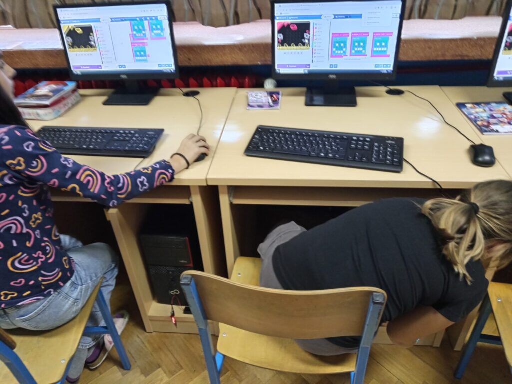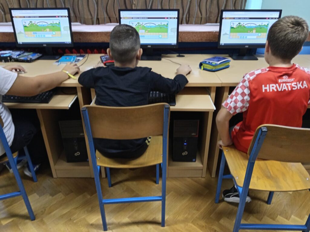 Četvrtaši su online aktivnošću Beaver Achiever pomagali dabru graditelju da izgradi branu u jezeru, a sadrži izazove slijeda blokova i jednostavnog ponavljanja blokova (petlji). U drugoj aktivnosti, učenici 4.b razreda upoznali su micro:bit, mikroračunalo koje ima brojne mogućnosti. Prije početka rada s micro:bit-ovima morali su spojiti sve potrebne dijelove s micro:bit-om, a nakon toga spojiti i micro:bit na računalo. A onda je moglo početi programiranje. Pozvati su editor u kojem se stvaraju programi Microsoft MakeCode for micro:bit te izradili svoj prvi program koji su pohranili na micro:bit te izvršili. Nakon početnog upoznavanja s mogućnostima micro:bit-a. učenici su uspješno izradili program koji simulira kockicu (kad protresemo micro:bit, on generira slučajan broj od jedan do šest) te program koji broji korake.