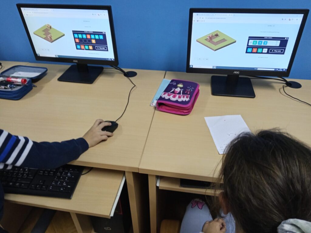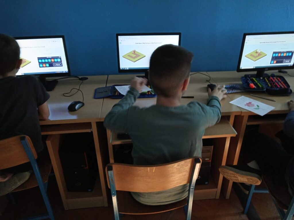 Učenici su trećih razreda umjesto pisanja naredbi, u online aktivnosti CodeMonkey Jr. programirali malog majmunčića da dođe do škrinje s blagom slaganjem niza vizualnih uputa blokovima naredbi koji predstavljaju kôd. S napredovanjem izazova učenici CodeMonkey Jr. rano stječu razumijevanje temeljnih koncepata programiranja. Pokazavši se u toj aktivnosti vrlo uspješnim, trećaši su dobili još jedan izazov, pomoći kroz 27 zadataka vjeverici da stigne do češera. I taj su zadatak učenici uspješno svladali. U unplugged aktivnosti trećaši su slijedili upute na papiru i kao rezultat dobili lik. Nema veće nagrade za učiteljicu kad učenik tijekom aktivnosti kaže “Ovo je baš zabavno!”. I na kraju je učiteljica trećašima priredila mali izazov, tj. upute za kretanje. Baš je bilo izazovno.