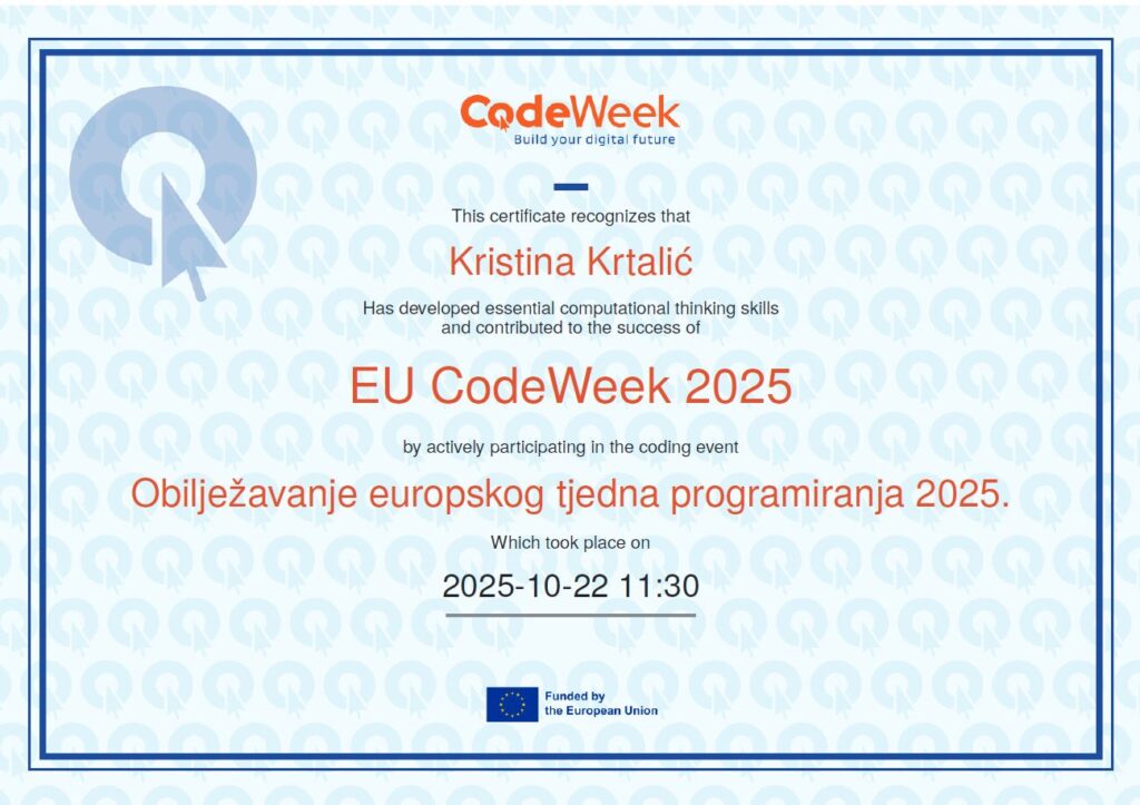 Učenici i učenice razredne nastave (3.a, 3.b i 4.b) te predmetne nastave (5.do 8. razreda) matične škole su od 11. do 26. listopada unplugged i računalnim aktivnostima obilježili Europski tjedan programiranja (EU Code Week 2025). Europski tjedan programiranja je inicijativa koja slavi kreativnost, rješavanje problema i suradnju izraženu pomoću kodiranja i računalnog razmišljanja. Učenje kodiranja pomaže u njegovanju niza temeljnih vještina kao što su kreativnost, logika, kritičko razmišljanje i vještine rješavanja problema. Ranim upoznavanjem s kodiranjem učenici se mogu bolje pripremiti za izazove 21. stoljeća. Kako korištenje računala sve više zasićuje društvo, na budućim inženjerima je da inoviraju i dizajniraju softver za poboljšanje kvalitete života.