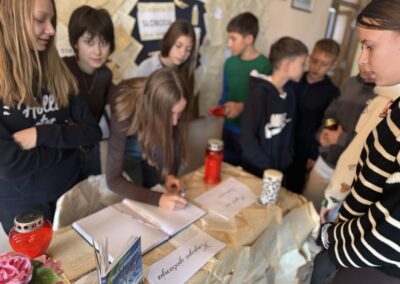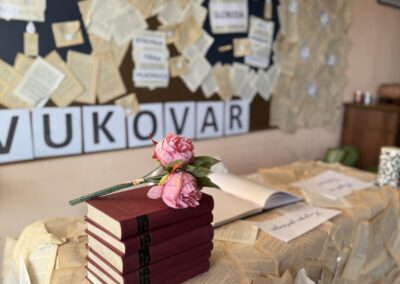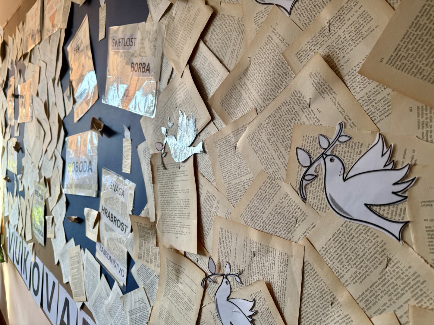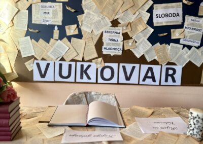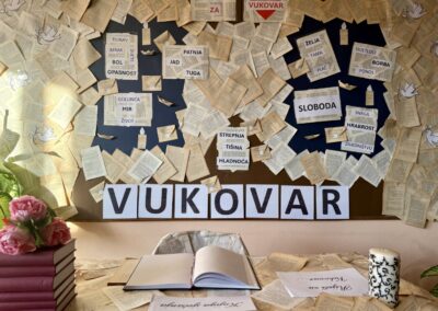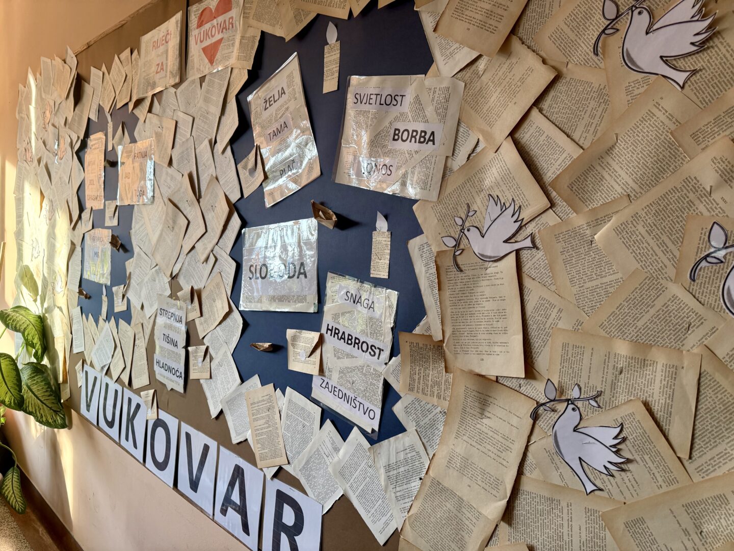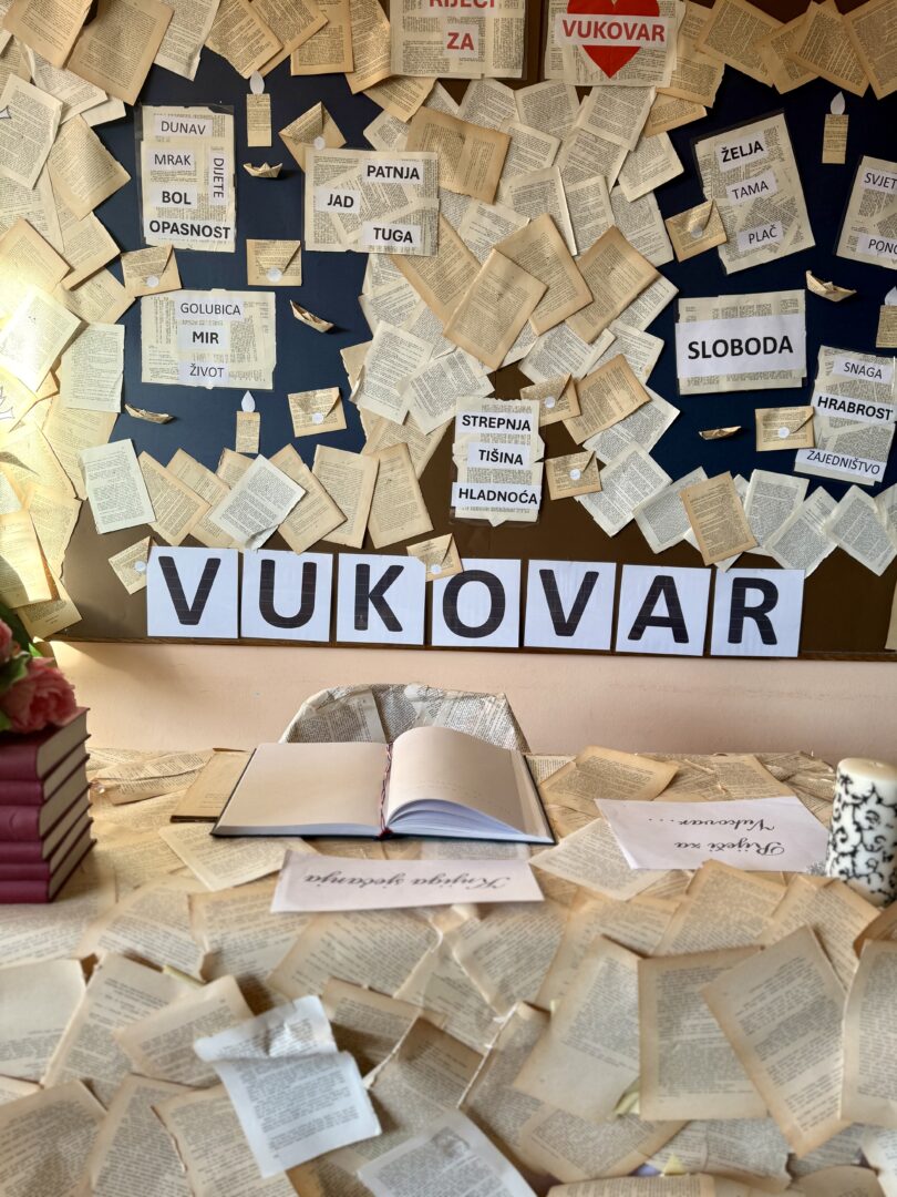Mladi knjižničari i ove školske godine sudjelovali su u obilježavanju Dana sjećanja na žrtve Domovinskog rata i Dana sjećanja na žrtvu Vukovara i Škabrnje. Prigodnim uređenjem prostora i panoa Riječi za Vukovar ispred školske knjižnice u MŠ, Knjigom sjećanja, izražajnim čitanjem Glavaševićeve “Priče o vremenu” ispred panoa Mjeseca hrvatske knjige i ispred svih učenika MŠ te izradom videozapisa stvorenog od fotografija učenika i djelatnika naše škole, doprli su do mnogih srca… Da se nikada ne zaboravi…