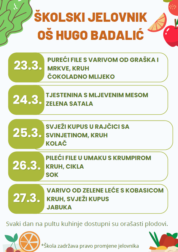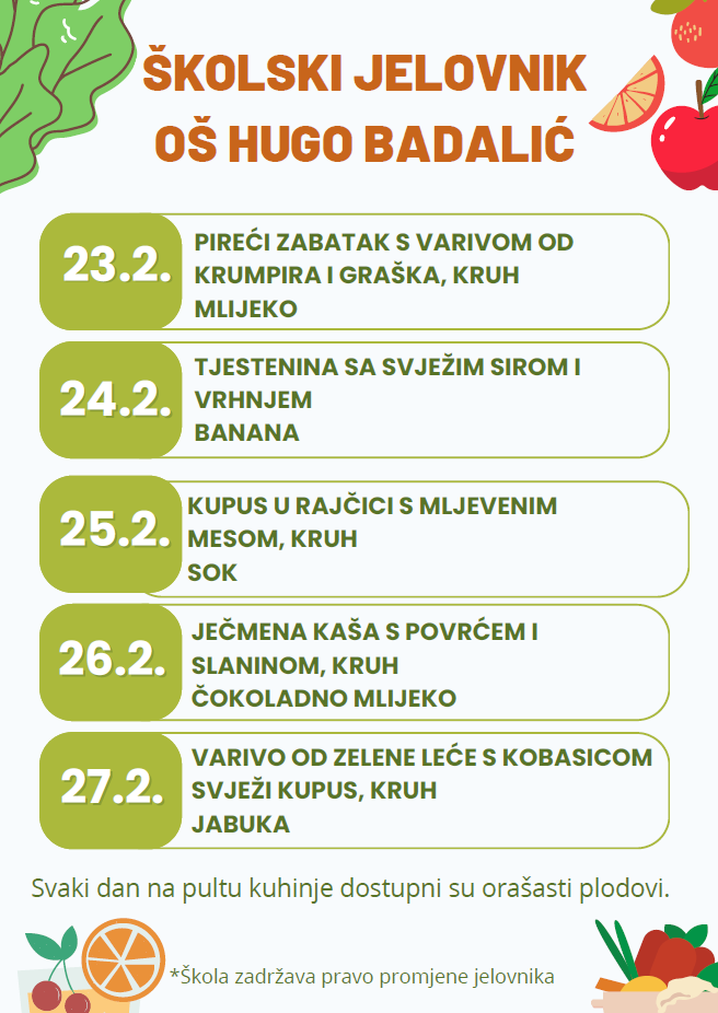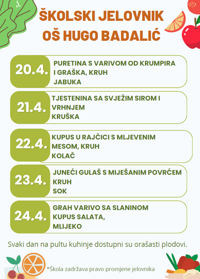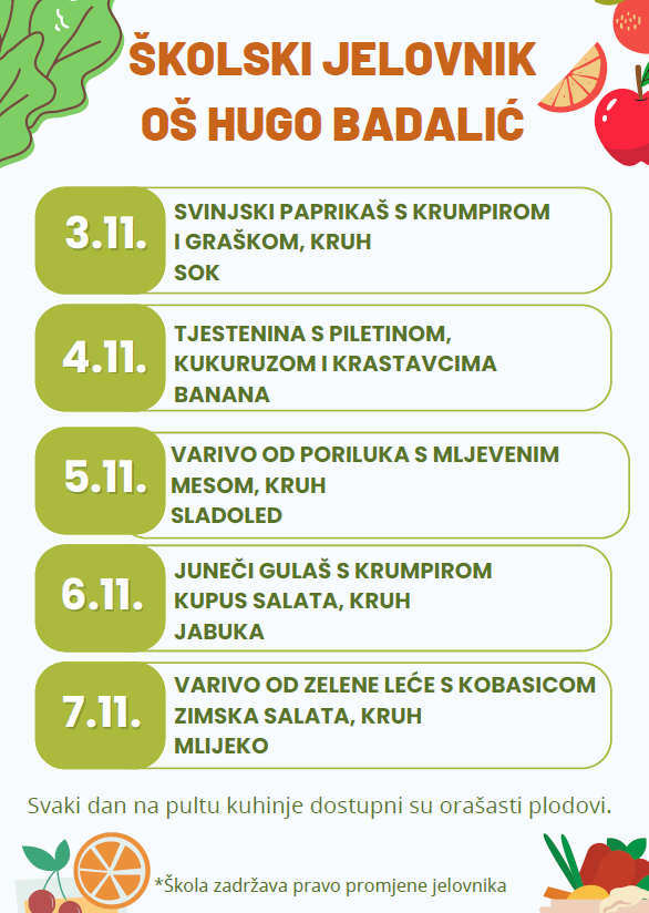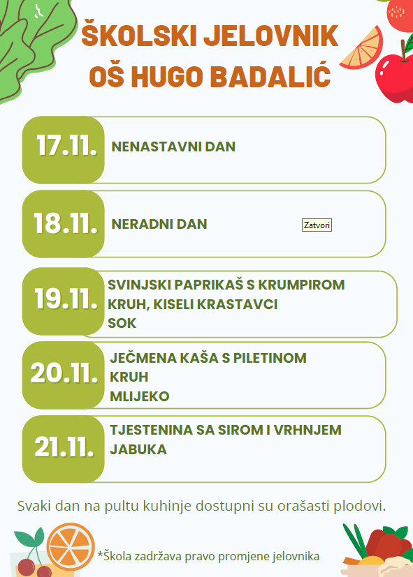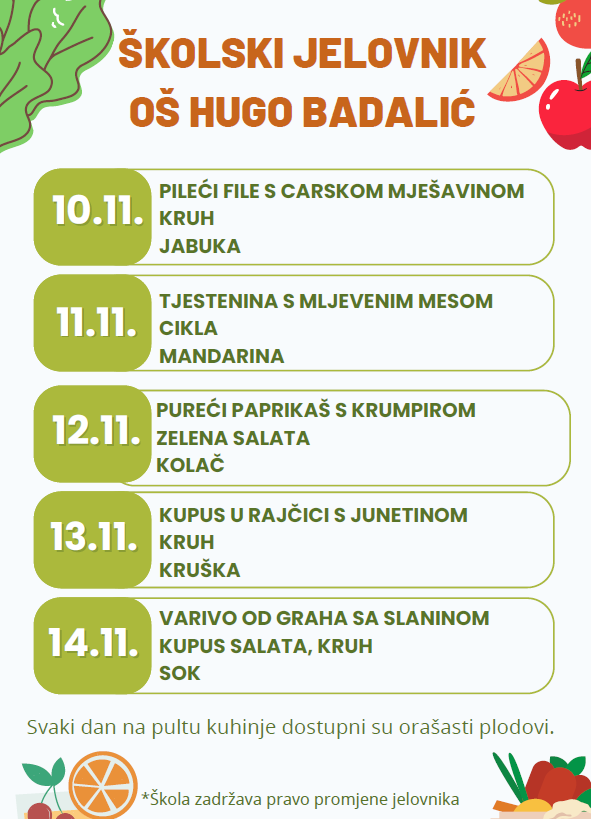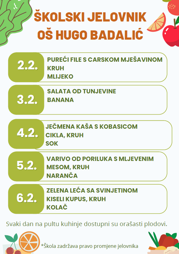 Odlukom Vlade Republike Hrvatske školska užina za sve učenike financira se iz državnog proračuna. U nastavku možete pročitati jelovnik: