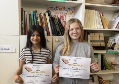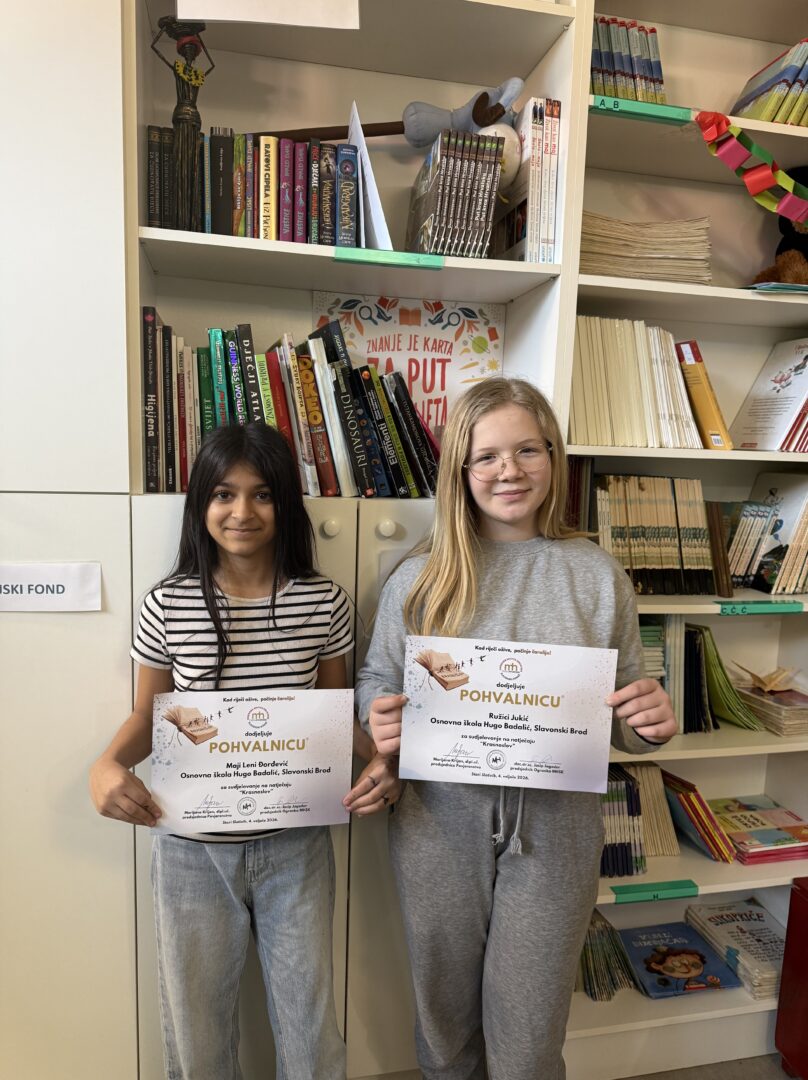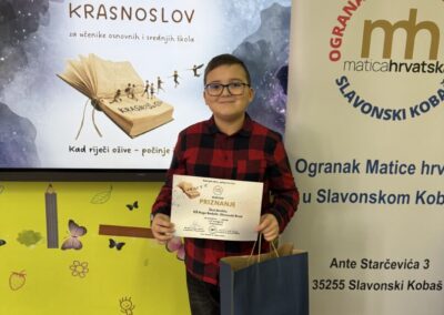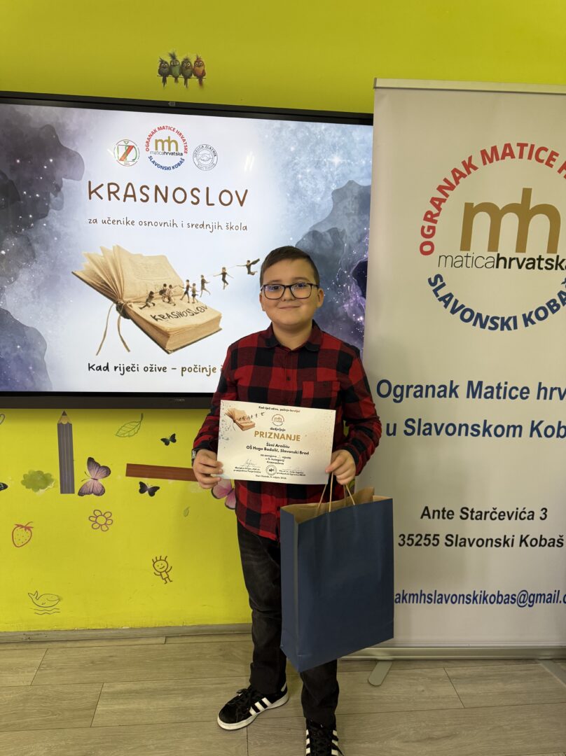 Ove školske godine školska je knjižničarka na natječaj Krasnoslov: “Kad riječi ožive – počinje čarolije” prijavila troje učenika, učenike koji vrijedno i marljivo pohađaju izvannastavnu aktivnost Mladi knjižničari. Svatko je recitirao pjesmu koja je po kriterijima natječaja bila propisana za njihovu kategoriju. Maja Lena Đorđević (5.c) krasnoslovila je ili recitirala pjesmu Dragutina Tadijanovića “Visoka žuta žita”, a Ružića Jurić (6. c) pjesmu Ivana Gorana Kovačića “Pada snijeg”, uz Šimu Aračiča (6.b) koji je recitirao pjesmu Dobriše Cesarića “Početak proljeća” i koji je na kraju i jedini pozvan iz naše škole na završno krasnoslovljenje u PŠ Stari Slatinik. Šimo je pobijedio u svojoj kategoriji, o čemu smo ranije pisali. Čestitamo svim sudionicima, krasnoslovit ćemo i sljedeće godine.