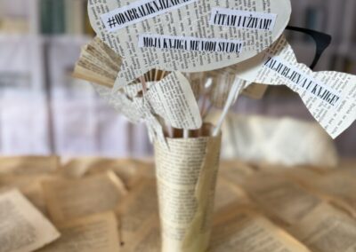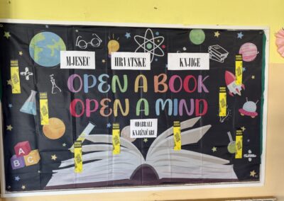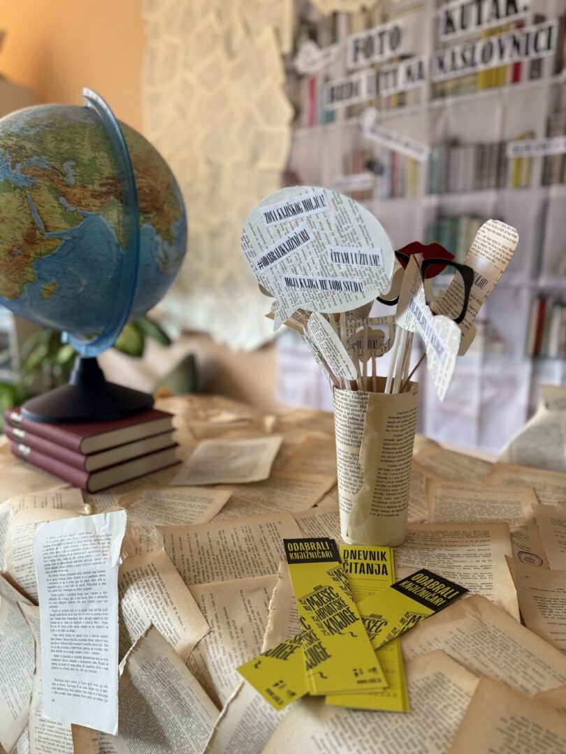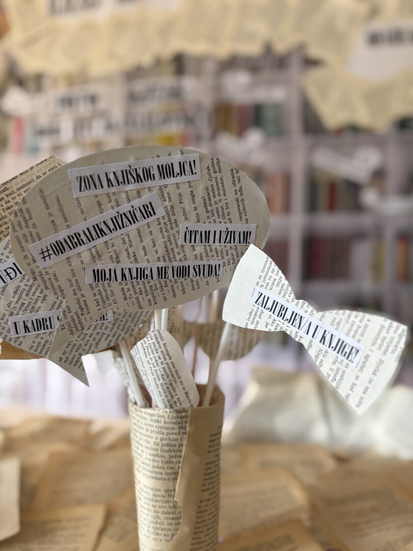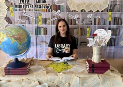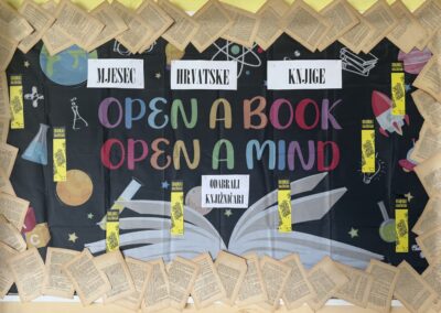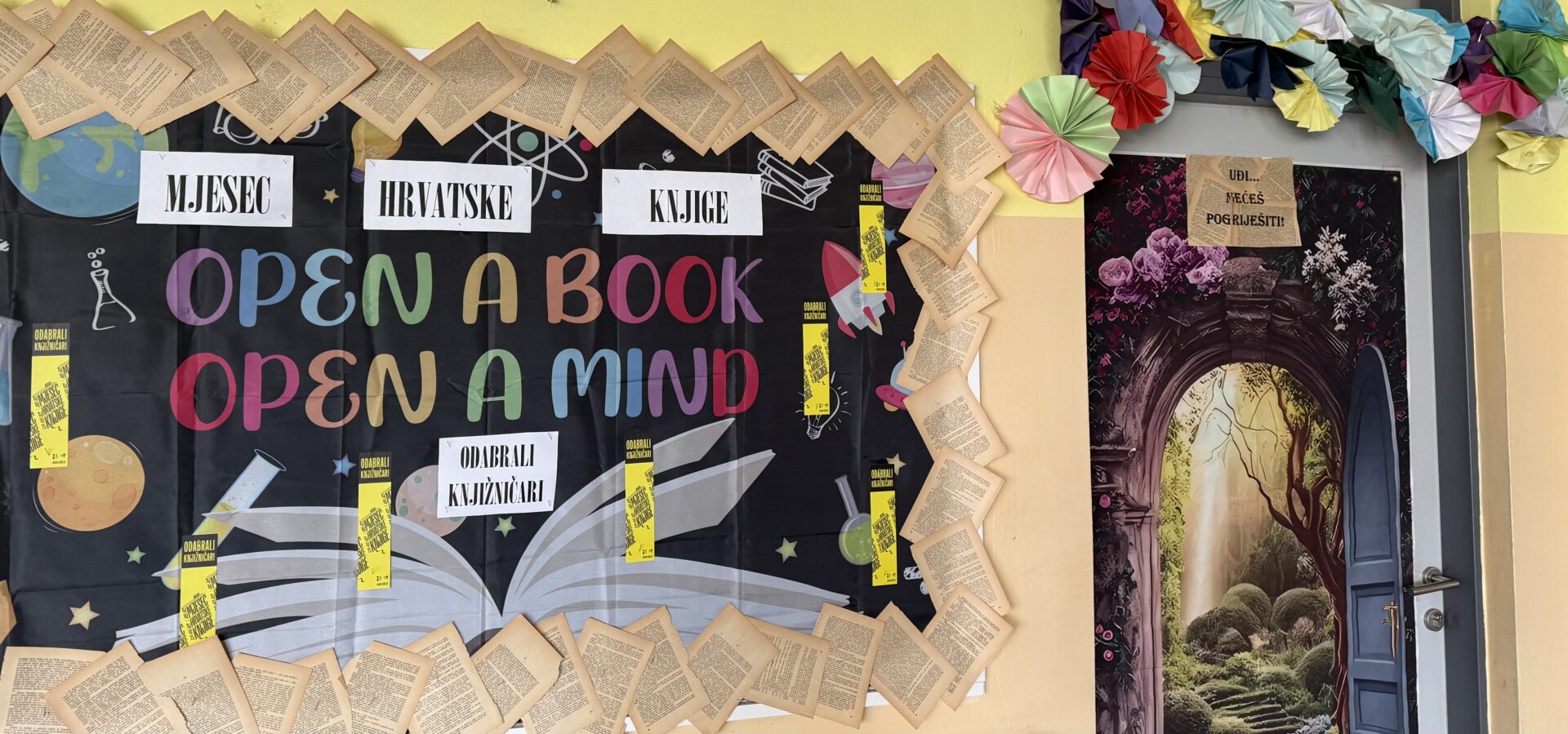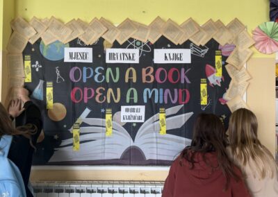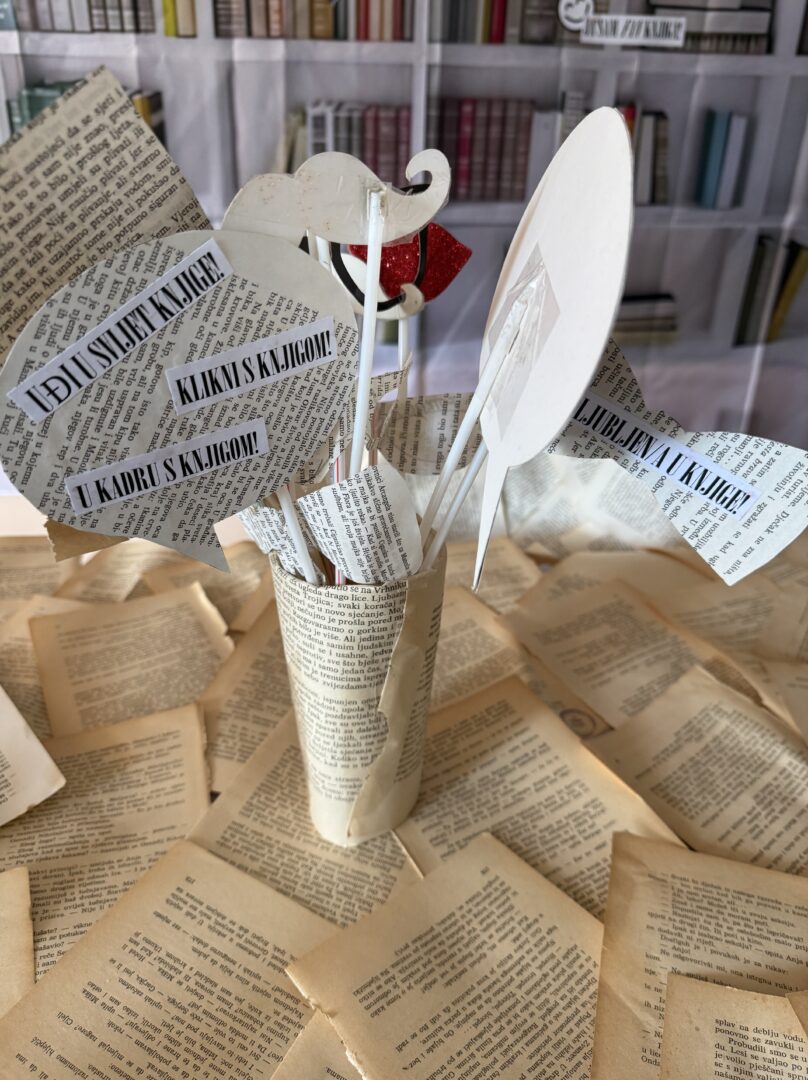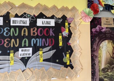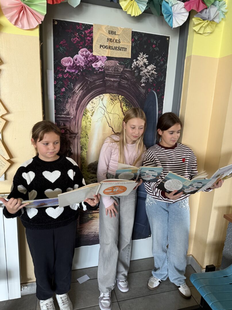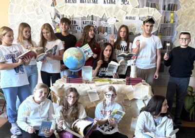 Mladi knjižničari su od stranica otpisanih knjiga uredili panoe u obje školske zgrade te stvorili bajkovitu kulisu za fotografiranje. Uz dodatak rekvizita, kulisa je zasjala u knjižničnom sjaju, otpisane knjige dobile su novu ulogu, a učenici, učitelji i djelatnici novo osvježenje u školskom holu. Pogledajte i uvjerite se…