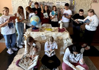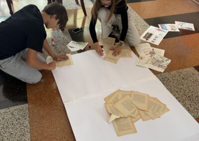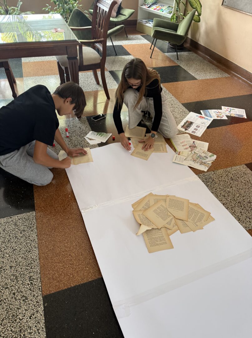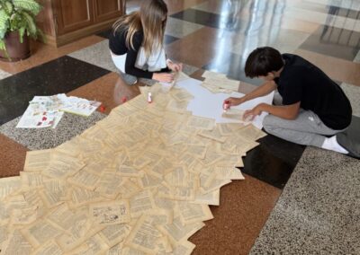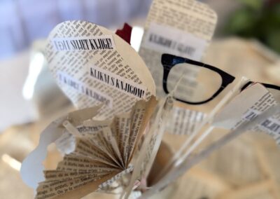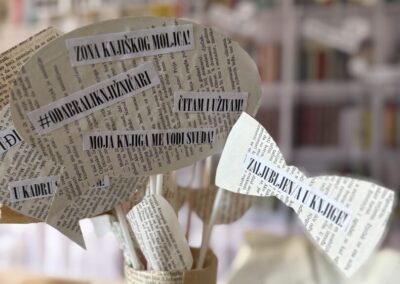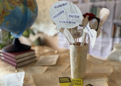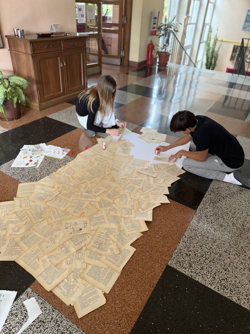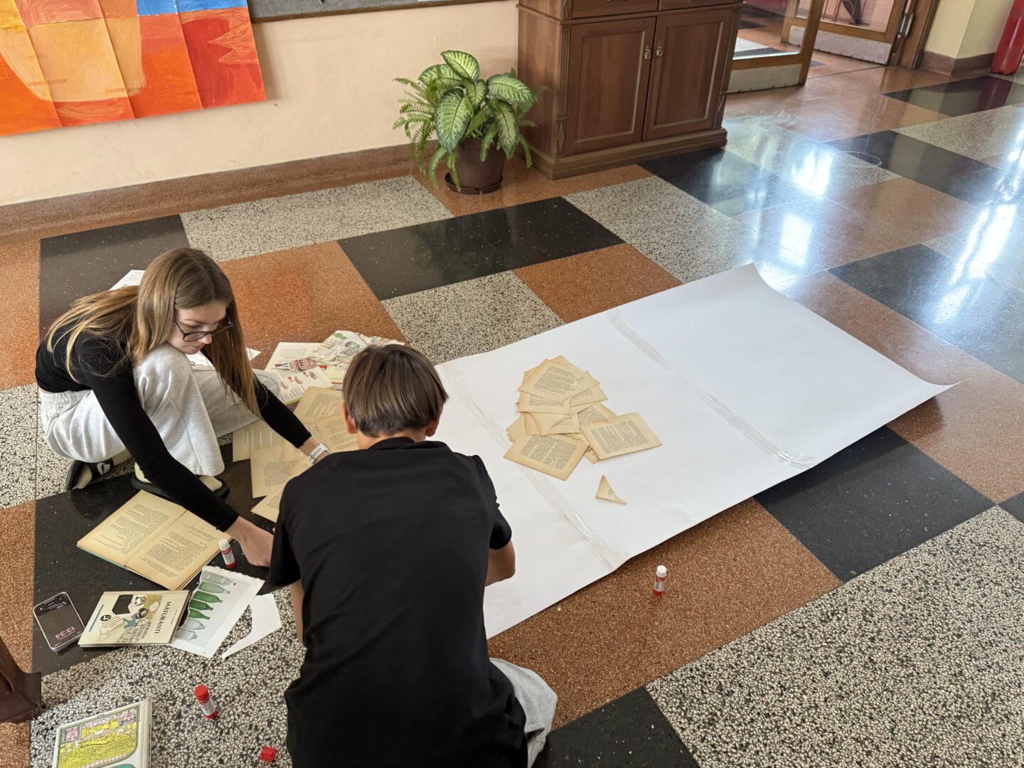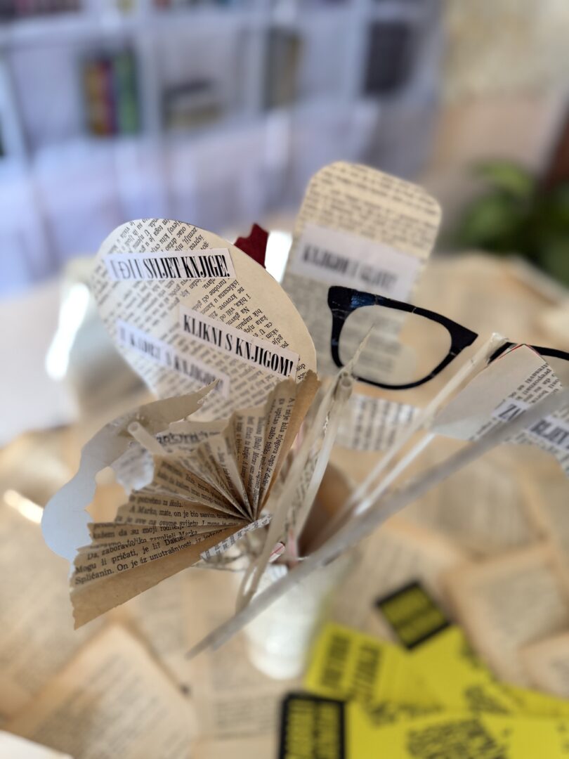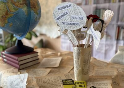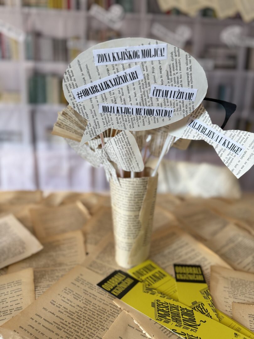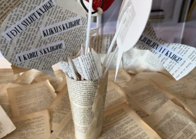Mladi knjižničari su od stranica otpisanih knjiga uredili panoe u obje školske zgrade te stvorili bajkovitu kulisu za fotografiranje. Uz dodatak rekvizita, kulisa je zasjala u knjižničnom sjaju, otpisane knjige dobile su novu ulogu, a učenici, učitelji i djelatnici novo osvježenje u školskom holu. Pogledajte i uvjerite se…