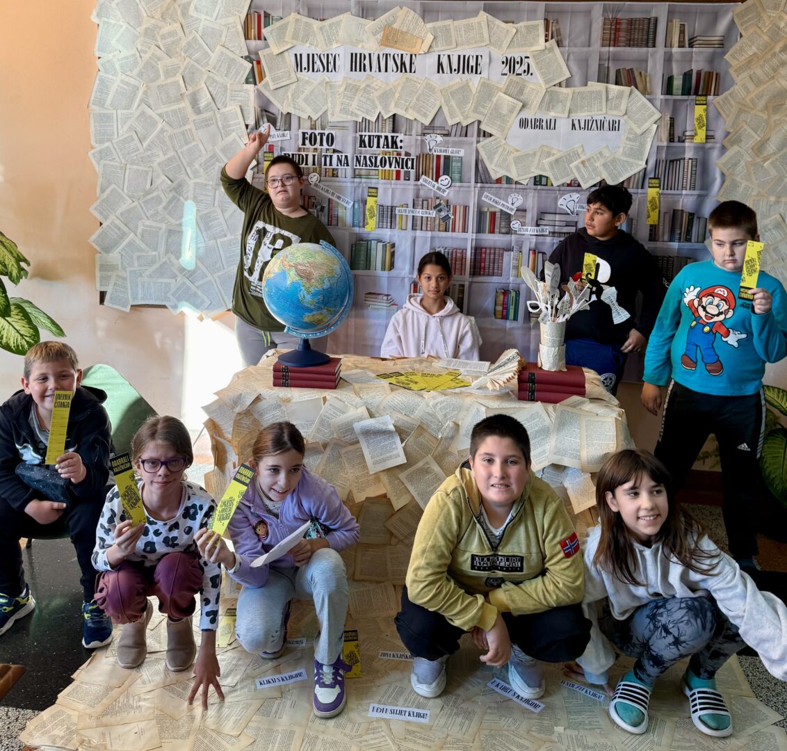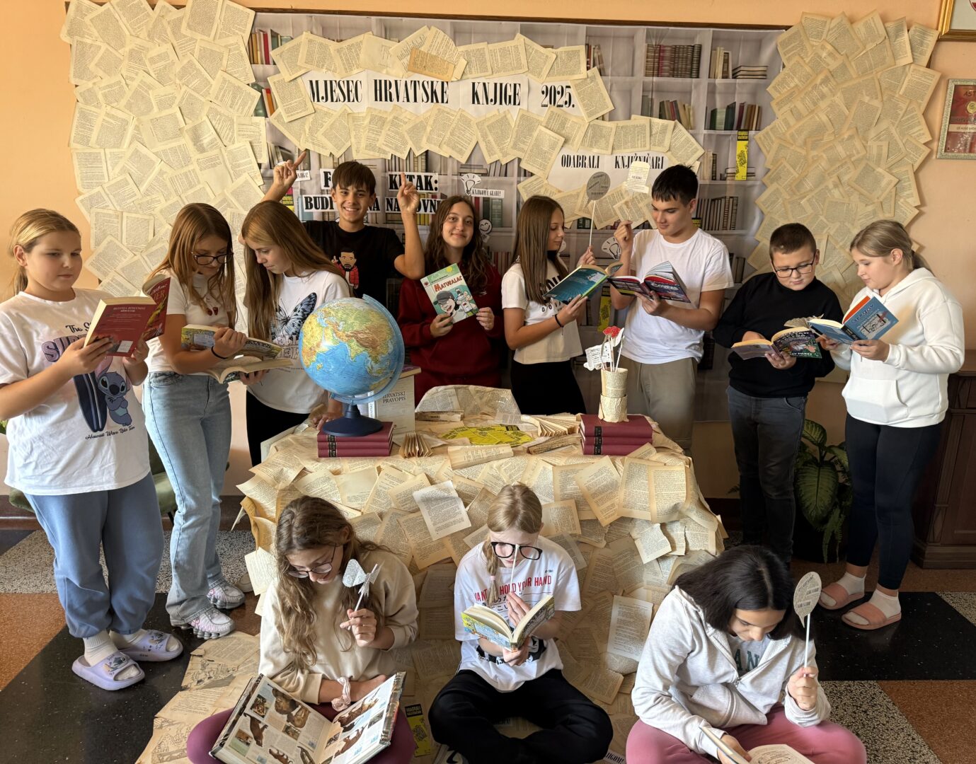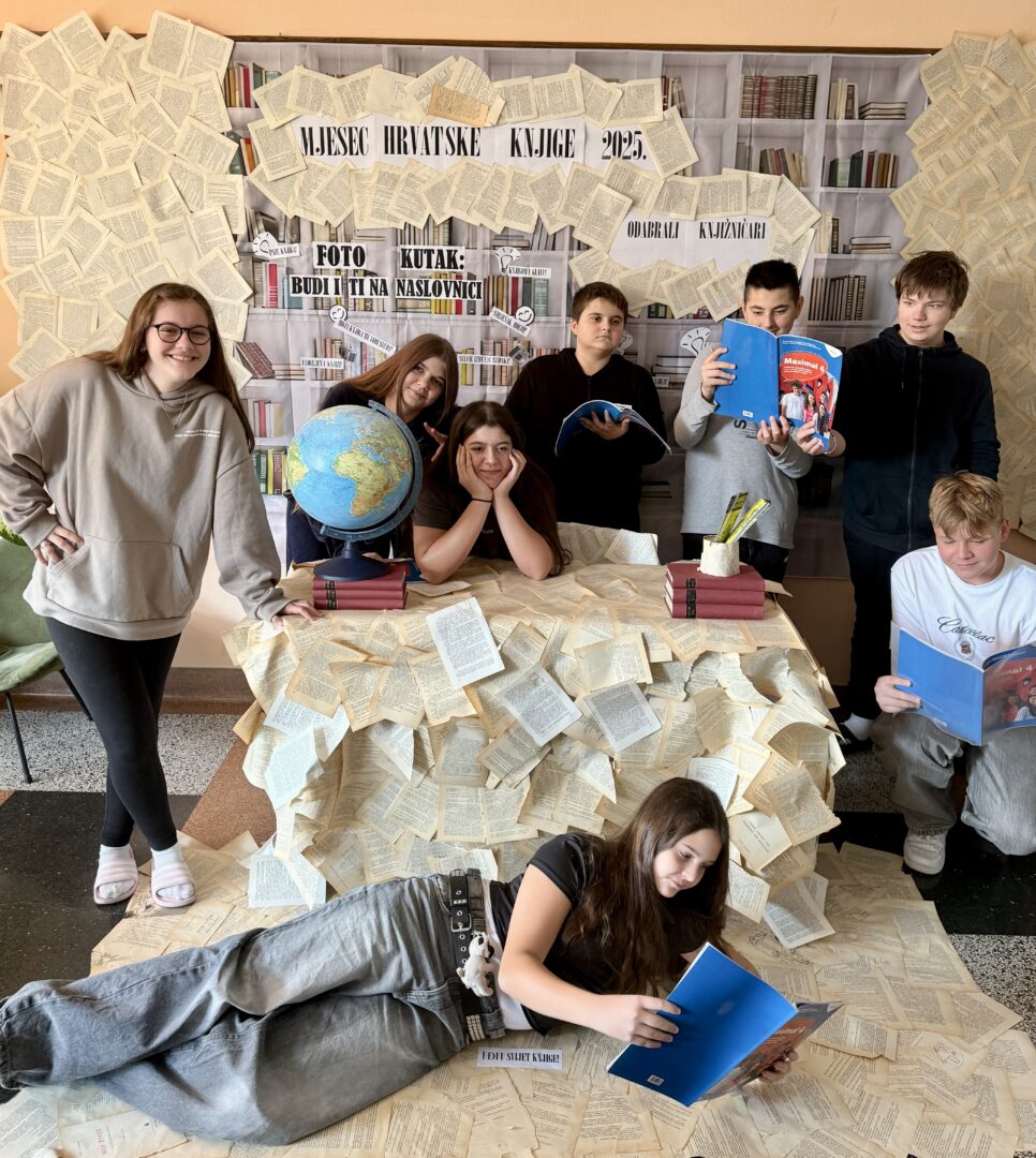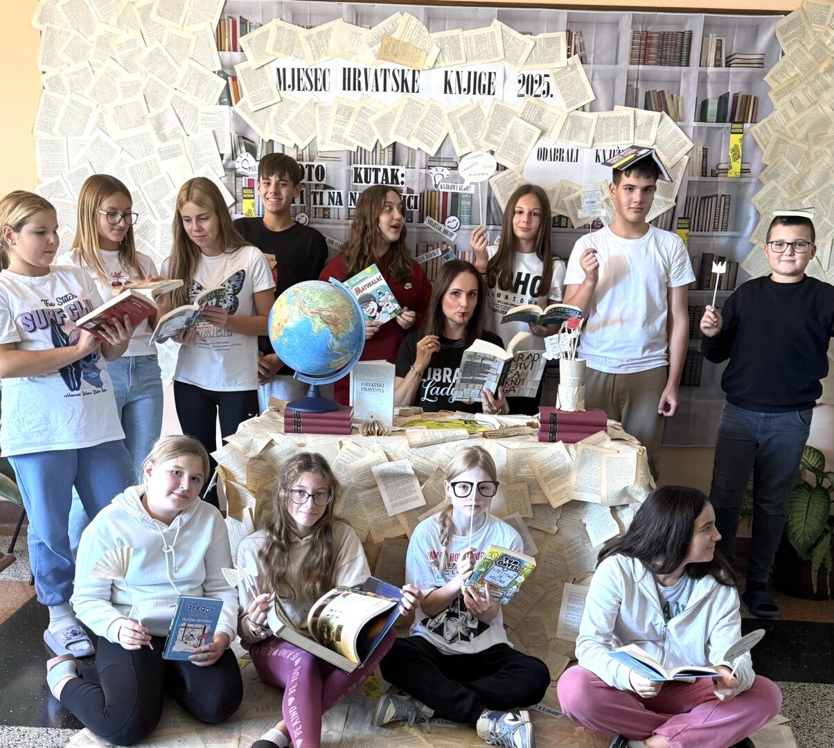 Dragi čitatelji, počeo je Mjesec hrvatske knjige (15.10. – 15.11.) u kojemu slavimo knjigu i pisanu riječ te različitim događanjima privlačimo korisnike u knjižnice pokazujući i dokazujući kako knjižnice nisu samo mjesta posudbe. Tako je ovaj događaj već tradicionalan i nezaobilazan i u našoj školskoj knjižnici. Knjižničarka i Mladi knjižničari prijavili su nekoliko događanja na službenoj patformi Mjeseca hrvatske knjige https://www.mhk.hr/programi/ od akcije darivanja otpisanih knjiga, pričaonica za najmlađe, susreta s piscem te naravno estetskog uređenja knjižnice i prostora ispred nje. U tome najviše uživamo jer tada prostor zaživi s cijelom školom, a ovaj put ovako uređen prostor kliknuo je s našim učenicima i djelatnicima i stavio ih u fokus, odnosno na naslovnicu!