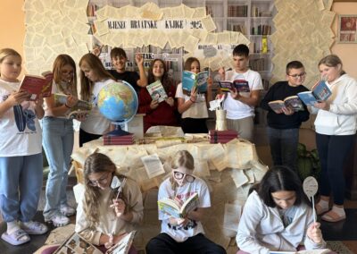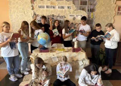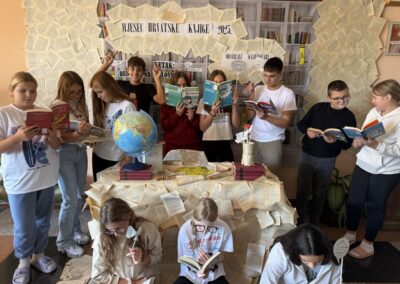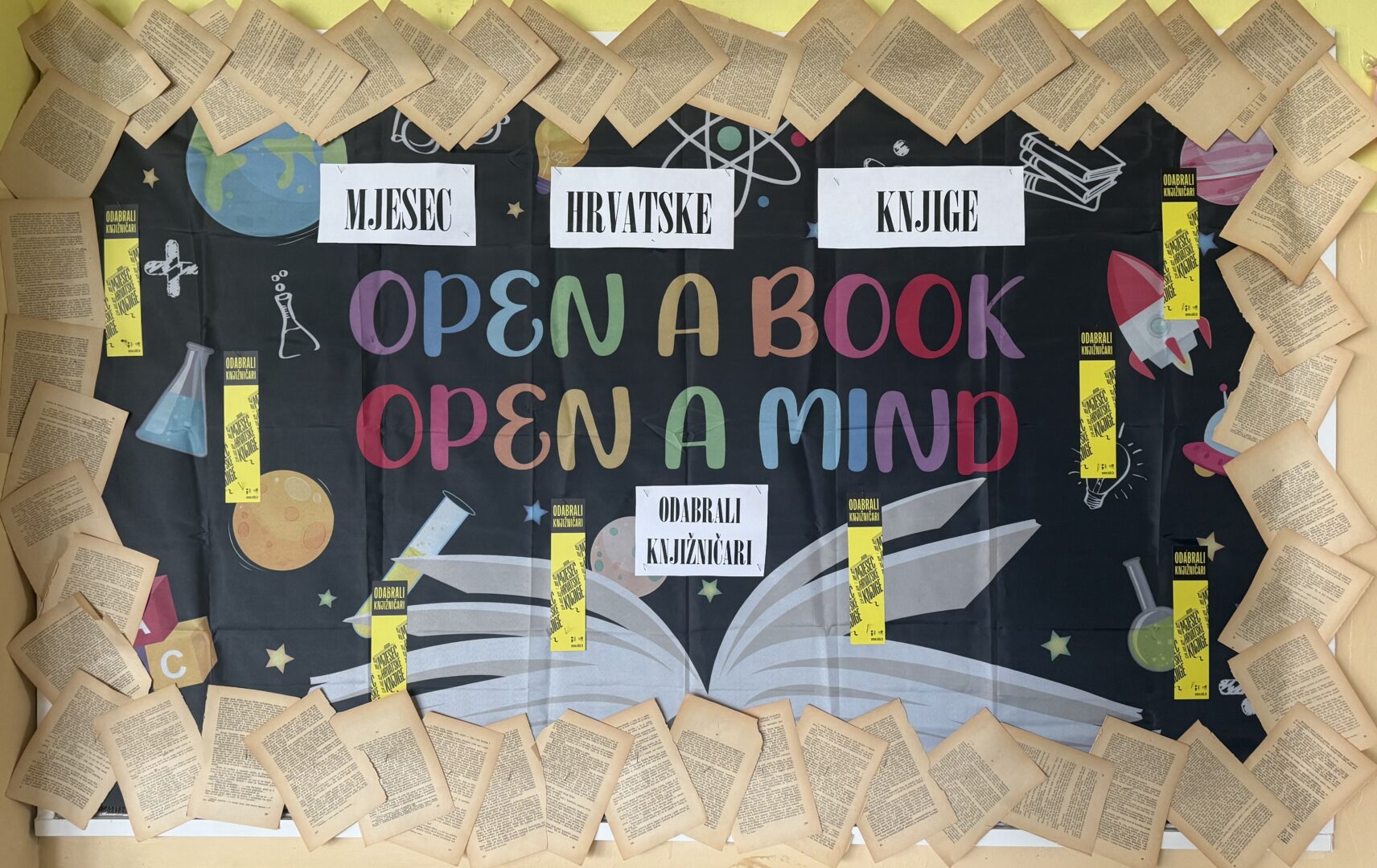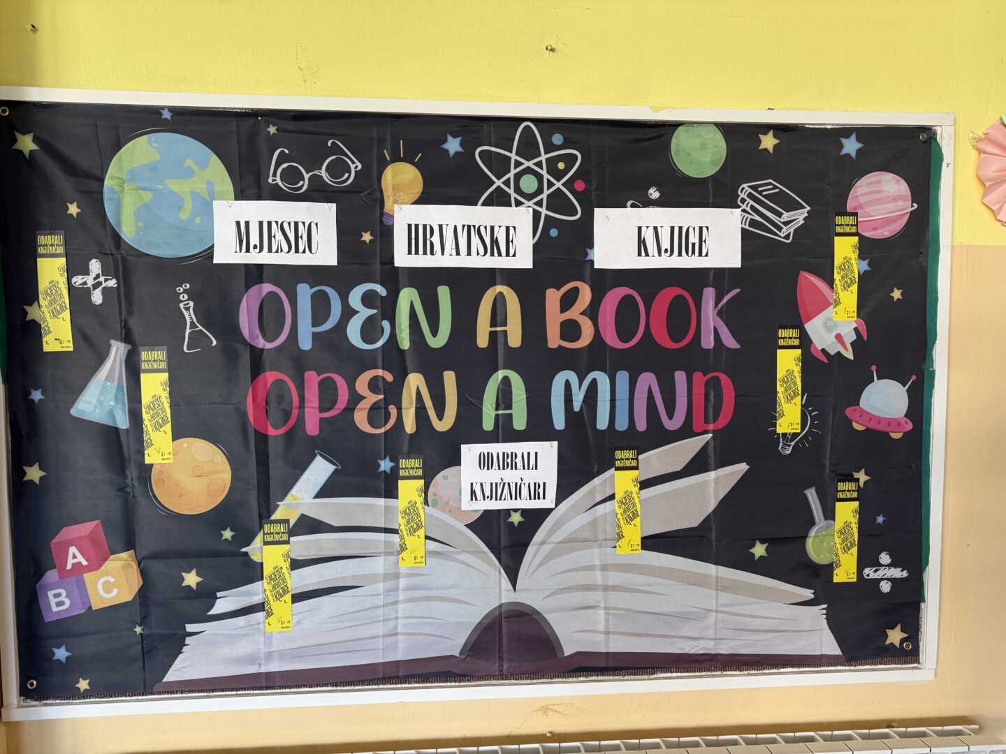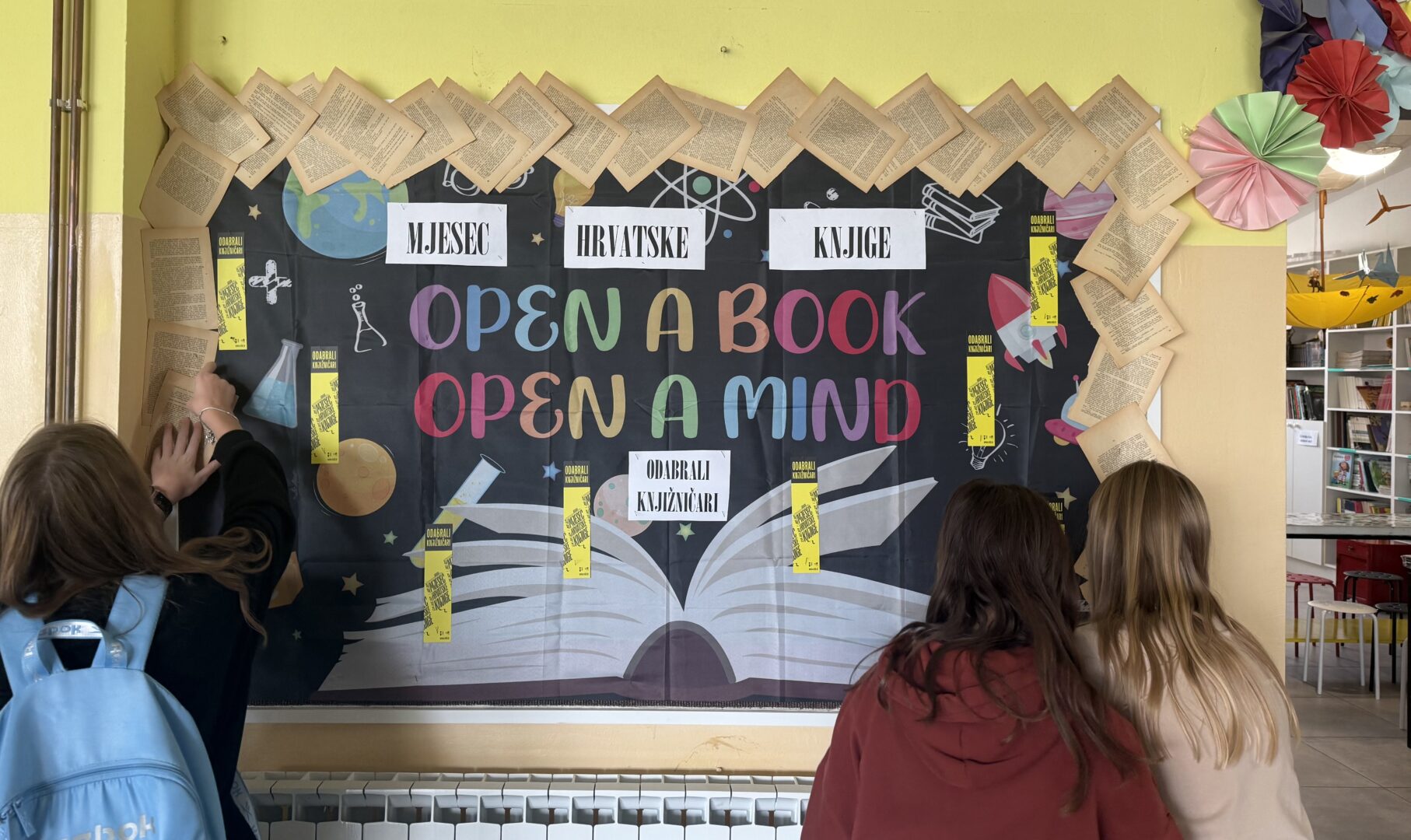 Dragi čitatelji, počeo je Mjesec hrvatske knjige (15.10. – 15.11.) u kojemu slavimo knjigu i pisanu riječ te različitim događanjima privlačimo korisnike u knjižnice pokazujući i dokazujući kako knjižnice nisu samo mjesta posudbe. Tako je ovaj događaj već tradicionalan i nezaobilazan i u našoj školskoj knjižnici. Knjižničarka i Mladi knjižničari prijavili su nekoliko događanja na službenoj patformi Mjeseca hrvatske knjige https://www.mhk.hr/programi/ od akcije darivanja otpisanih knjiga, pričaonica za najmlađe, susreta s piscem te naravno estetskog uređenja knjižnice i prostora ispred nje. U tome najviše uživamo jer tada prostor zaživi s cijelom školom, a ovaj put ovako uređen prostor kliknuo je s našim učenicima i djelatnicima i stavio ih u fokus, odnosno na naslovnicu!