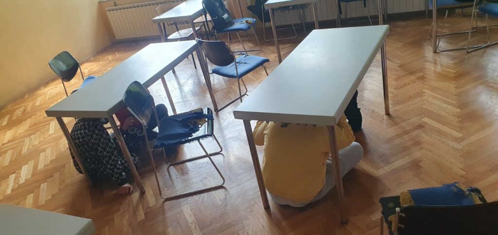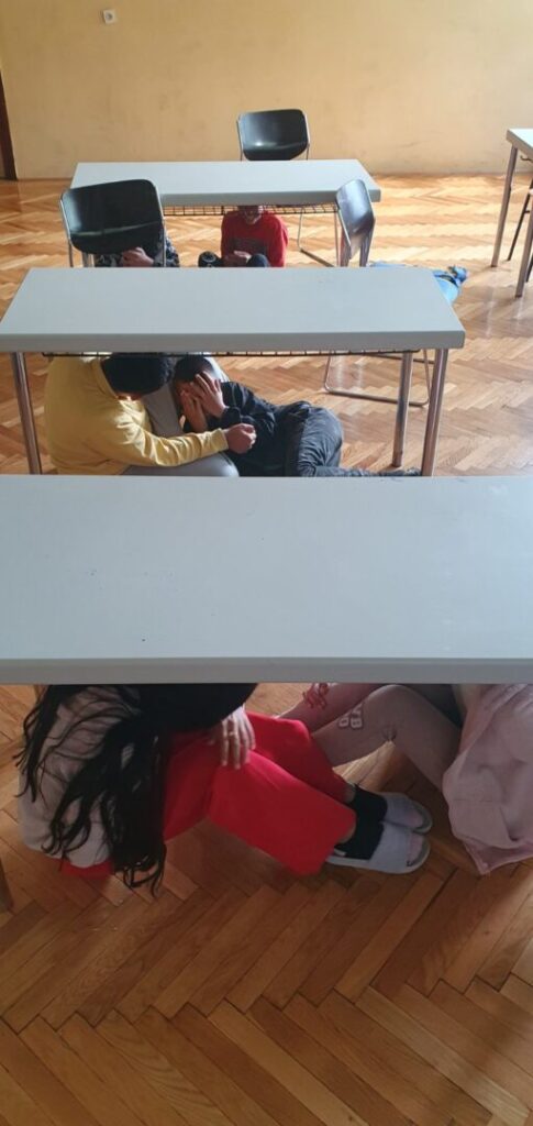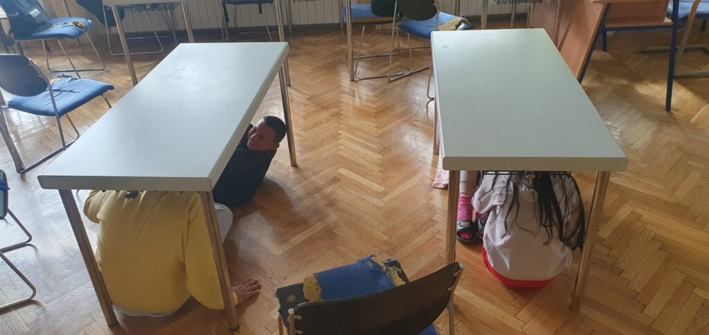 Učenici šestog razreda s nastavnikom Pejom Jozićem odradili su aktivnost Sigurnosni postupak u slučaju potresa – “Sagni se, prekrij i drži za… “. S učenicima se najprije razgovaralo o potresima te o ponašanju nakon potresa. Istaknuta je važnost smirenosti u takvim situacijama te kako se ne bi smjelo odmah istrčavati van. Učenici su nakon toga odradili simulaciju situacije za vrijeme potresa. Skrivali su se ispod stolova, a nakon toga su jednom rukom prekrili glavu, a drugom držali nogu stola.