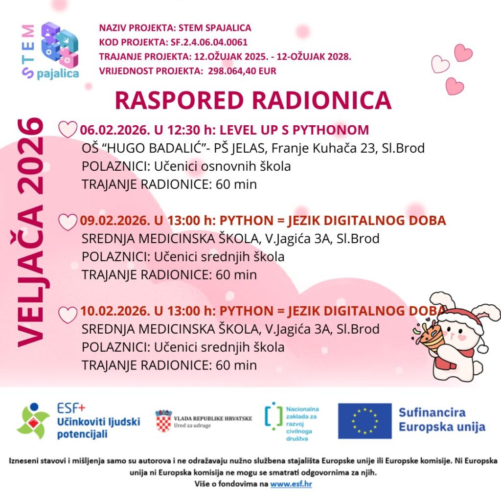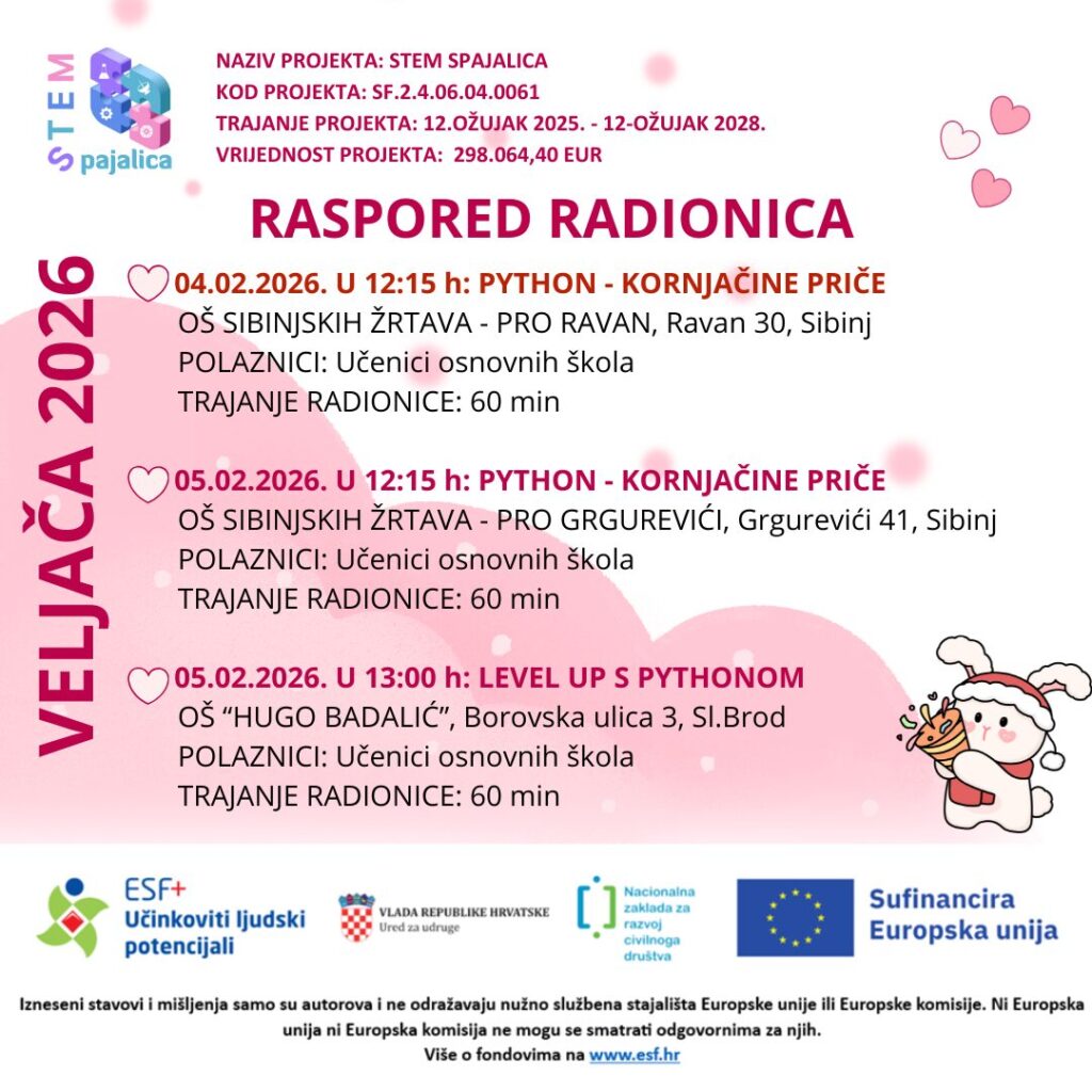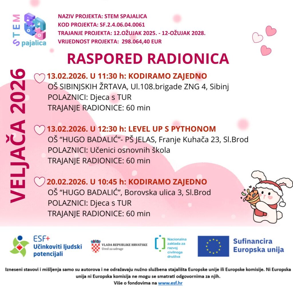 Sve radionice su besplatne! Projekt „STEM SPAJALICA“ sufinanciran je sredstvima Europske Unije iz Europskog socijalnog fonda plus putem Nacionalne zaklade za razvoj civilnog društva u okviru poziva “Jačanje kapaciteta organizacija civilnog društva za promociju STEM-a”